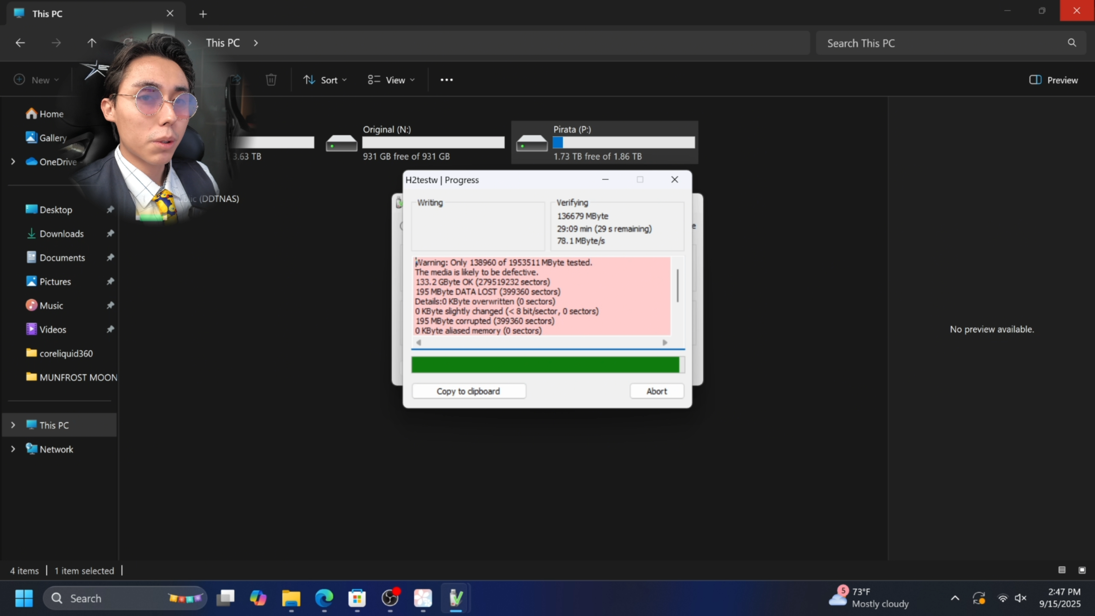 Con el rendimiento por los suelos, sabíamos que la estafa era profunda. El clímax de nuestra investigación llegó al pasar la prueba de la herramienta H2TestW. Esta herramienta es crucial para verificar el espacio real de una unidad: la llena de archivos y luego verifica su integridad. Si los archivos desaparecen o se corrompen, el espacio mostrado es falso.